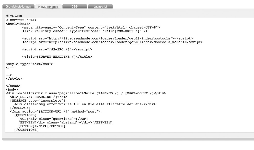 Insert your entire html source code. By creating a new template, MAILINGWORK generates a sample html source code with all important survey-placeholders automatically in this tab.