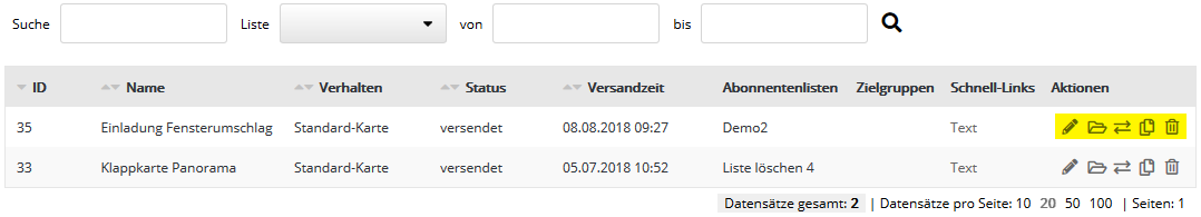 Hier sehen Sie das 'Kartenarchiv' von versendeten Postkarten. Es kann genutzt werden, um bereits versendete Postkarten durch 'Kopieren' wiederherzustellen und so für künftige Postkarten zu nutzen. Sie finden die kopierte Postkarte in der 'Postkarten-Zentrale', in der Sie sie auch wieder bearbeiten können.
