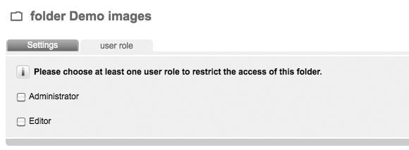 Enter a name and a optional description for your folder. Set those user roles in tab 'user role', who should be able to access the folder.