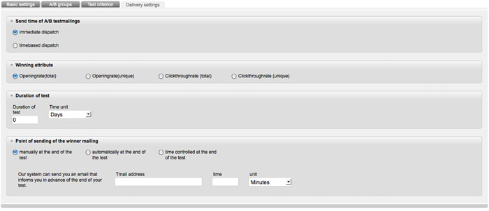 In the last tab you define the settings for the dispatch. Determine by which criterion (opening-rate or click-through-rate) MAILINGWORK should identify the winner. Equally important is to determine the duration of the test.