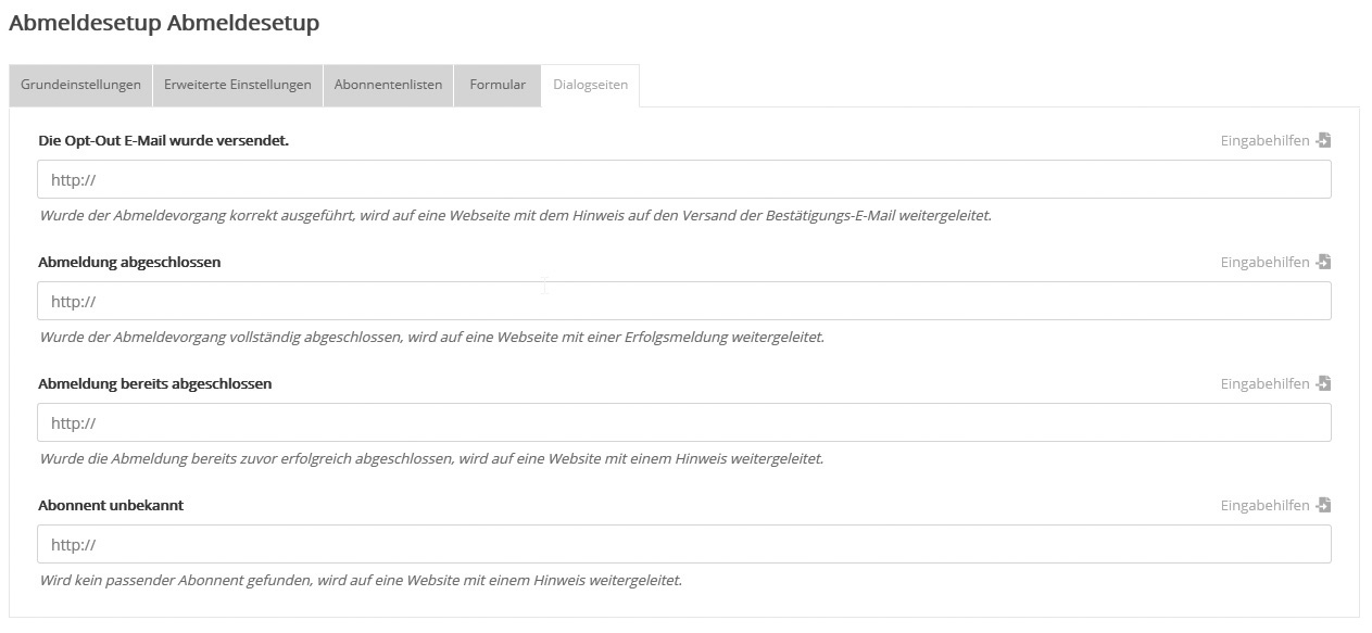 AbonnentenlistenJe nachdem, ob die Abmeldung per Newsletter-Link oder per Website-Formular stattfindet, wird der Abonnent aus folgenden Listen abgemeldet: Variante 1: Abmeldelink im NewsletterFür Standardmails gilt: Zusätzlich zu den auf dem Reiter 'Abonnentenlisten' gewählten Listen findet die Abmeldung auch in den angeschriebenen Listen statt. Für Kampagnen- und Dialogmails gilt dieser Zusatz nicht, da diese nicht an eine bestimmte Liste verschickt werden. Variante 2: Abmeldeformular auf WebsiteDie Abmeldung findet in den unter 'Abonnentenlisten' markierten Listen statt, und wenn vorhanden, dann auch in den direkt im Formular zur Auswahl durch den Nutzer angebotenen Listen (siehe nächster Abschnitt 'Formular'). Beides gleichzeitig ist nicht möglich. Das heißt: Sobald Sie eine Liste im Reiter 'Abonnentenlisten' markiert haben (und damit fest vorgeben), kann sie nicht gleichzeitig im Abmelde-Formular (ab)wählbar sein. Im dem Fall wird sie automatisch aus dem Formular entfernt und umgekehrt. Sonderfall beim Abmeldeformular: Ist keine Liste zur Abmeldung markiert und auch im Formular keine enthalten, dann findet die Abmeldung in allen Listen statt. Damit wird der Abonnent auch aus der 'Abonnentenverwaltung' entfernt. FormularHier erstellt MAILINGWORK automatisch den Quellcode für ein Abmeldeformular, das Sie auf Ihrer Website einbinden können. Den Inhalt des Formulars stellen Sie per Drag&Drop zusammen. Die Bedienung ist identisch zum Anmeldeformular-Editor. Nach Klick auf den Button 'Test des Formulars' wird Ihr neues Abmeldeformular angezeigt und die Funktion lässt sich anhand realer Abmeldungen testen. Geben Sie gültige und ungültige Abonnentendaten ein, um die entsprechenden Textmeldungen bzw. Dialogseiten zu prüfen. Ein während des Tests abgemeldeter Abonnent lässt sich unter 'Abonnenten' -> 'Abmeldungen' wiederherstellen. --> Hinweis zu Abmeldungen beim Testversand: Solange es sich um den Testversand eines Mailings handelt, findet bei Klick auf den Abmeldelink keine Abmeldung statt. Stattdessen wird lediglich eine Bestätigung angezeigt, ob das Abmeldesetup korrekt eingerichtet wurde. Erst beim späteren realen Versand findet eine tatsächliche Abmeldung statt und es erscheint die von Ihnen eingestellte Dialogseite, die Sie unter 'Formular testen' jederzeit testen können. Dialogseiten |